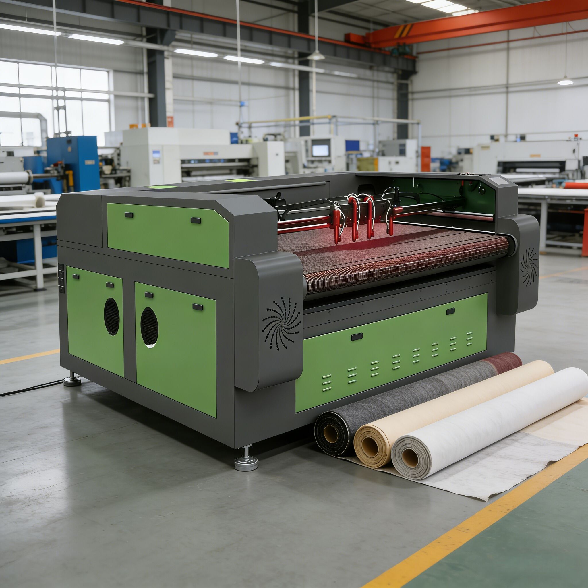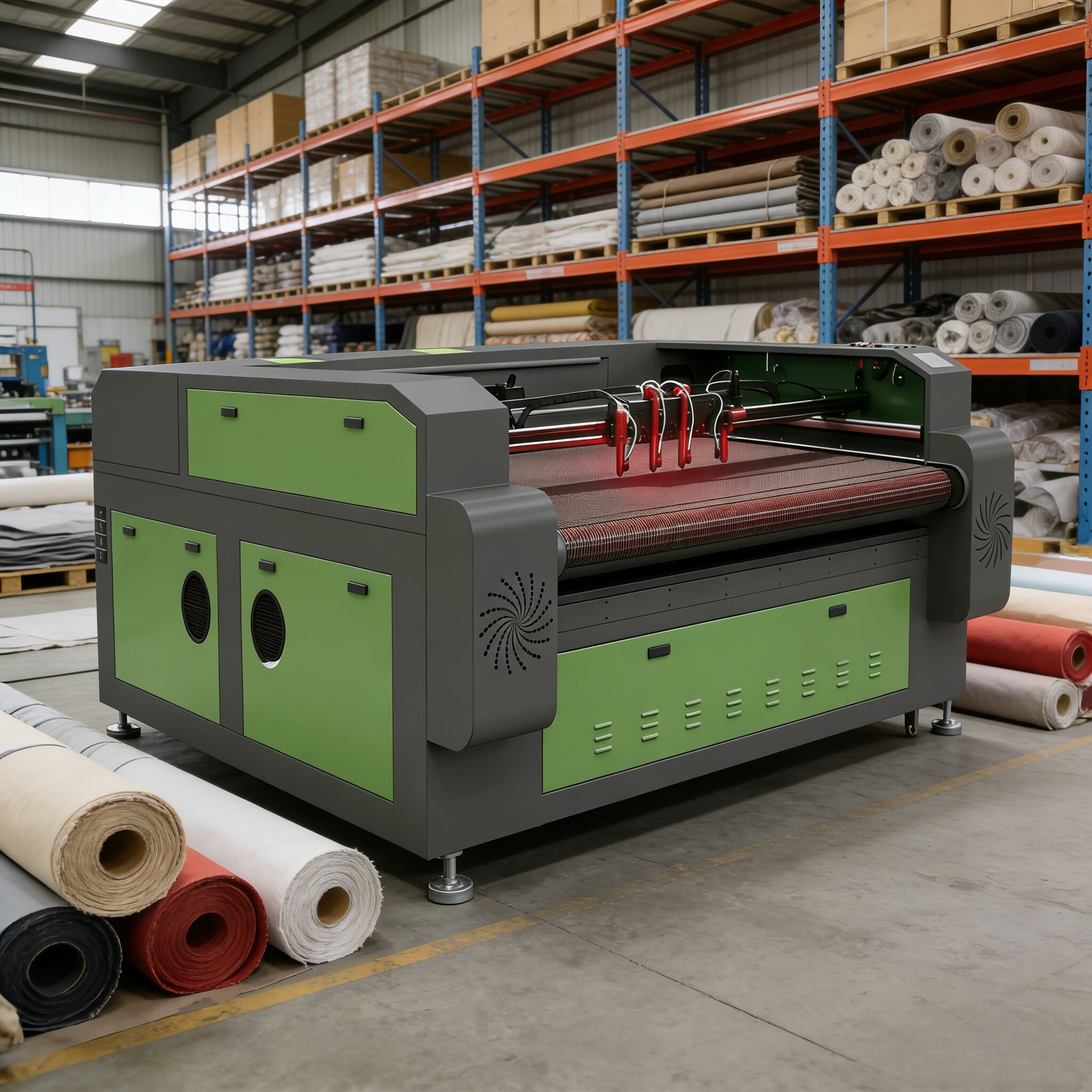 | Automatic fabric feeder with dual rollers & control panel for stable material transport. | Automatic fabric feeding roller for continuous roll material cutting. |