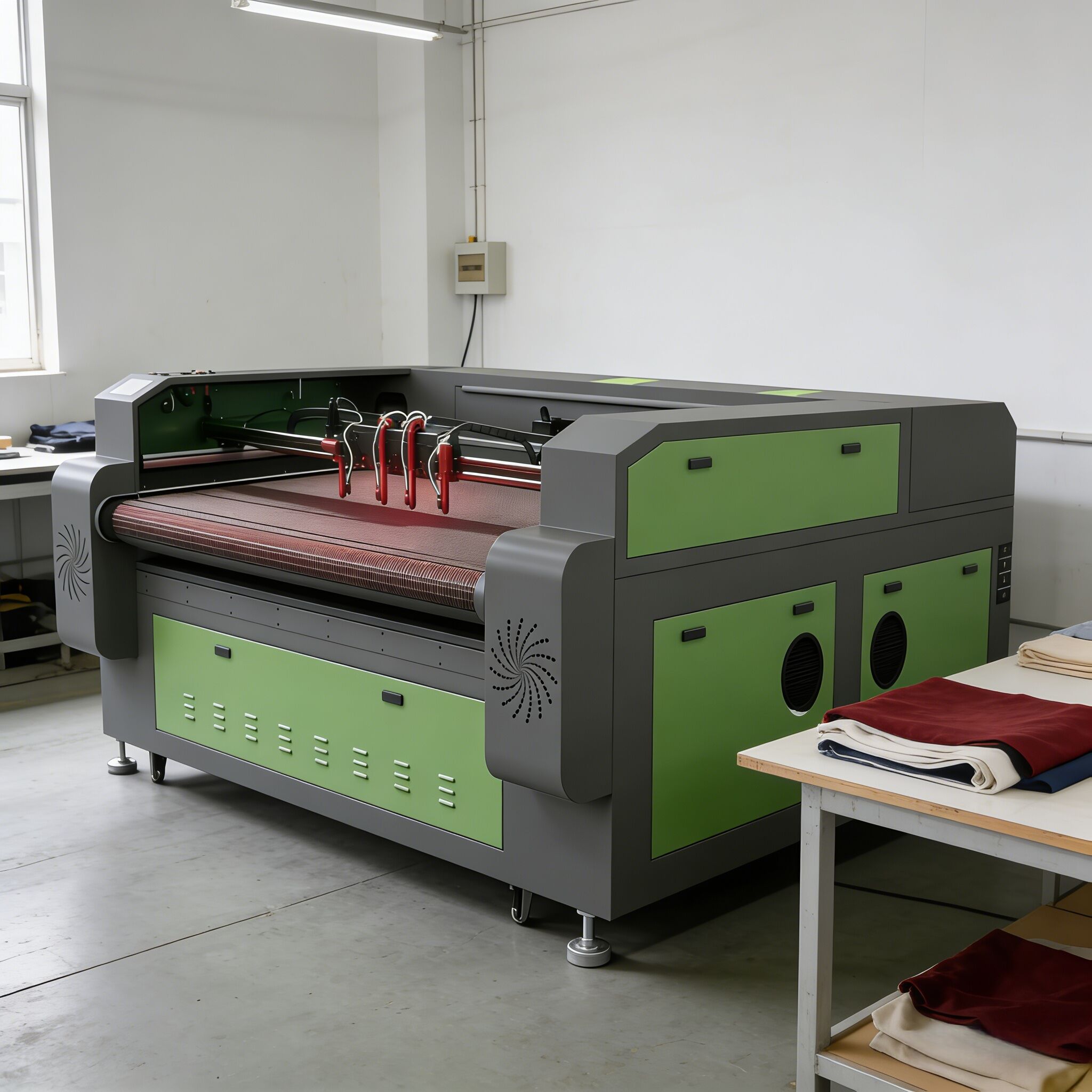 | CW-5200 industrial chiller for laser equipment cooling. | Double-beam dual-laser fabric cutter precise, clean-cut for garment materials. |